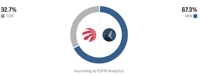 赛前,美媒ESPN预测本场比赛,猛龙胜率32.7%,森林狼胜率67.3%。